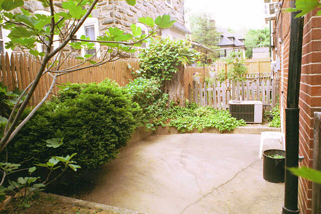 The yard is very small, and most of it is taken up by a cement patio. It also extends around the side of the house, where it is grass. We're planning on putting up a fence so Niven can have a "cat run".