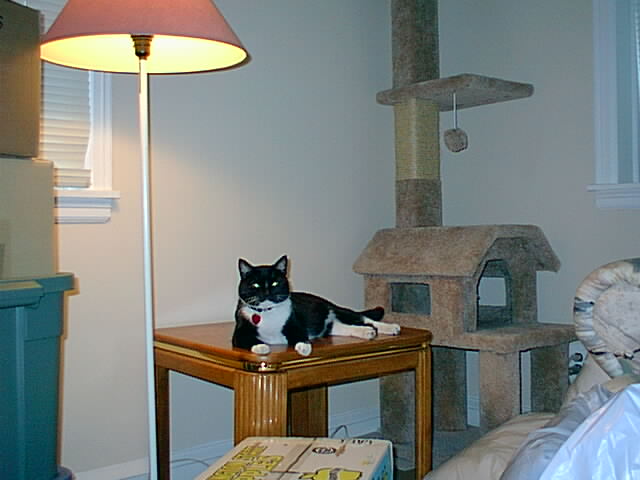 Niven is wearing his collar and tags, in case he gets out during the move.